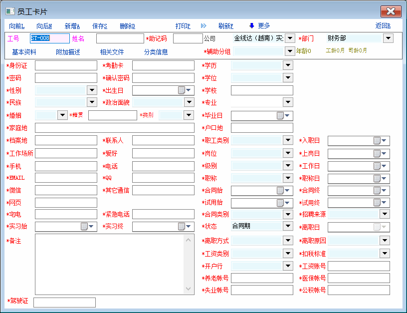 有用户在论坛发帖希望员工卡片的必填项目控件名能设置为红色以便能突出显示出来让人事资料建档人员录入资料时一目了然,在官方没有更新这个功能之前,可以先参考我的这个脚本(我增加了控件名前面加*)以达到使用需求 必填项目有增减的,需要重新登录才能刷新 打开员工卡片编辑辅助脚本定义(rec.emp) extern change_obj; int func_f9_call() { //msg('f9 pressed'); return 1; }; int func_show_win() { int i,count; string sql,Mzd,v; db_run("select col_id from app_not_null_def where tab_id='emp'")//获取员工卡片必填项目定义明细 count = db_row_count();//已定义的控件数 gui_set_font_color('Label27',16711935);//工号 gui_set_font_color('Label28',16711935);//姓名 for (i = 0; i < count;i++) { db_go_row(i); Mzd = db_res(0) if(Mzd == 'dept_id'){ gui_set_font_color('Label_Dept',0x0000ff); gui_set_text("Label_Dept",'*'+gui_get_text("Label_Dept"))//1.部门 }if(Mzd == 'cross_group_id'){ gui_set_font_color('Label1',0x0000ff); gui_set_text("Label1",'*'+gui_get_text("Label1"))//2.辅助分组 }if(Mzd == 'nation'){ gui_set_font_color('Label_Nation',0x0000ff); gui_set_text("Label_Nation",'*'+gui_get_text("Label_Nation"))//3.民族 }if(Mzd == 'polity'){ gui_set_font_color('Label_Polity',0x0000ff); gui_set_text("Label_Polity",'*'+gui_get_text("Label_Polity"))//4.政治面貌 }if(Mzd == 'marriage_flag'){ gui_set_font_color('Label_Marriage_Flag',0x0000ff); gui_set_text("Label_Marriage_Flag",'*'+gui_get_text("Label_Marriage_Flag"))//5.婚姻 }if(Mzd == 'college'){ gui_set_font_color('Label_College',0x0000ff); gui_set_text("Label_College",'*'+gui_get_text("Label_College"))//6.学校 }if(Mzd == 'specialty'){ gui_set_font_color('Label_Specialty',0x0000ff); gui_set_text("Label_Specialty",'*'+gui_get_text("Label_Specialty"))//7.专业 }if(Mzd == 'native_place'){ gui_set_font_color('Label_Native_Place',0x0000ff); gui_set_text("Label_Native_Place",'*'+gui_get_text("Label_Native_Place"))//8.籍贯 }if(Mzd == 'home_address'){ gui_set_font_color('Label_Home_Address',0x0000ff); gui_set_text("Label_Home_Address",'*'+gui_get_text("Label_Home_Address"))//9.家庭地 }if(Mzd == 'culture_degree'){ gui_set_font_color('Label_Culture_Degree',0x0000ff); gui_set_text("Label_Culture_Degree",'*'+gui_get_text("Label_Culture_Degree"))//10.学历 }if(Mzd == 'related_man'){ gui_set_font_color('Label_Related_Man',0x0000ff); gui_set_text("Label_Related_Man",'*'+gui_get_text("Label_Related_Man"))//11.联系人 }if(Mzd == 'graduate_date'){ gui_set_font_color('Label_Graduate_Date',0x0000ff); gui_set_text("Label_Graduate_Date",'*'+gui_get_text("Label_Graduate_Date"))//12.毕业日 }if(Mzd == 'sex'){ gui_set_font_color('Label_Sex',0x0000ff); gui_set_text("Label_Sex",'*'+gui_get_text("Label_Sex"))//13.性别 }if(Mzd == 'birthday'){ gui_set_font_color('Label_Birthday',0x0000ff); gui_set_text("Label_Birthday",'*'+gui_get_text("Label_Birthday"))//14.出生日 }if(Mzd == 'register_location'){ gui_set_font_color('Label_Register_Location',0x0000ff); gui_set_text("Label_Register_Location",'*'+gui_get_text("Label_Register_Location"))//15.户口地 }if(Mzd == 'file_location'){ gui_set_font_color('Label_File_Location',0x0000ff); gui_set_text("Label_File_Location",'*'+gui_get_text("Label_File_Location"))//16.档案地 }if(Mzd == 'work_location'){ gui_set_font_color('Label_Work_Location',0x0000ff); gui_set_text("Label_Work_Location",'*'+gui_get_text("Label_Work_Location"))//17.工作场所 }if(Mzd == 'avocation'){ gui_set_font_color('Label_Avocation',0x0000ff); gui_set_text("Label_Avocation",'*'+gui_get_text("Label_Avocation"))//18.爱好 }if(Mzd == 'residence_type'){ gui_set_font_color('Label_Residence_Type',0x0000ff); gui_set_text("Label_Residence_Type",'*'+gui_get_text("Label_Residence_Type"))//19.类别 }if(Mzd == 'note_info'){ gui_set_font_color('Label_Note_Info',0x0000ff); gui_set_text("Label_Note_Info",'*'+gui_get_text("Label_Note_Info"))//20.备注 }if(Mzd == 'telephone'){ gui_set_font_color('Label_Telephone',0x0000ff); gui_set_text("Label_Telephone",'*'+gui_get_text("Label_Telephone"))//21.电话 }if(Mzd == 'mobile'){ gui_set_font_color('Label_Mobile',0x0000ff); gui_set_text("Label_Mobile",'*'+gui_get_text("Label_Mobile"))//22.手机 }if(Mzd == 'email'){ gui_set_font_color('Label_Email',0x0000ff); gui_set_text("Label_Email",'*'+gui_get_text("Label_Email"))//23.EMAIL }if(Mzd == 'qq_no'){ gui_set_font_color('Label_Qq',0x0000ff); gui_set_text("Label_Qq",'*'+gui_get_text("Label_Qq"))//24.QQ }if(Mzd == 'msn_no'){ gui_set_font_color('Label_Msn',0x0000ff); gui_set_text("Label_Msn",'*'+gui_get_text("Label_Msn"))//25.微信 }if(Mzd == 'other_im_no'){ gui_set_font_color('Label_Other_Im_No',0x0000ff); gui_set_text("Label_Other_Im_No",'*'+gui_get_text("Label_Other_Im_No"))//26.其它通信 }if(Mzd == 'person_web'){ gui_set_font_color('Label_PersonWeb',0x0000ff); gui_set_text("Label_PersonWeb",'*'+gui_get_text("Label_PersonWeb"))//27.网页 }if(Mzd == 'home_phone'){ gui_set_font_color('Label_Home_Phone',0x0000ff); gui_set_text("Label_Home_Phone",'*'+gui_get_text("Label_Home_Phone"))//28.宅电 }if(Mzd == 'urgent_telephone'){ gui_set_font_color('Label_Urgent_Telephone',0x0000ff); gui_set_text("Label_Urgent_Telephone",'*'+gui_get_text("Label_Urgent_Telephone"))//29.紧急电话 }if(Mzd == 'paper_id'){ gui_set_font_color('Label_Paper_Id',0x0000ff); gui_set_text("Label_Paper_Id",'*'+gui_get_text("Label_Paper_Id"))//30.身份证 }if(Mzd == 'emp_card_no'){ gui_set_font_color('Label_Emp_Card_No',0x0000ff); gui_set_text("Label_Emp_Card_No",'*'+gui_get_text("Label_Emp_Card_No"))//31.考勤卡 }if(Mzd == 'dept_post'){ gui_set_font_color('Label_Dept_Post',0x0000ff); gui_set_text("Label_Dept_Post",'*'+gui_get_text("Label_Dept_Post"))//32.岗位 }if(Mzd == 'post_date'){ gui_set_font_color('Label_Post_Date',0x0000ff); gui_set_text("Label_Post_Date",'*'+gui_get_text("Label_Post_Date"))//33.上岗日 }if(Mzd == 'contract_type'){ gui_set_font_color('Label_Contrac