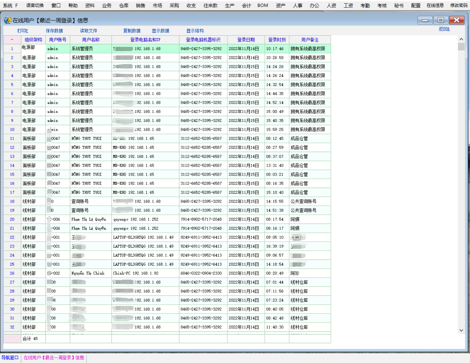 孟老师有更新了【get_online_user()】函数可以用来查看在线用户,在【主窗口脚本定义】脚本添加【menu_add_csp("MainMenu",24,'xxxxxx','在线用户','在线用户');】创建在线用户菜单 新建一个【在线用户】脚本文件【或导入附件脚本文件后根据实际情况修改】,提取当前在线用户账号来查询在线用户最后的登录信息,在此感谢【十二个耳环】老师的在线用户ID拼接写法支持 为保障隐私,限制了非管理员权限账号只能查看本人的登录信息 【登录时间】分解为格式化后的【登录日期】和【登录时刻】显示,这样更直观一点 脚本还可以优化,关联显示操作员所在组织架构分组和上级账号能查看所有在线的下级账号的登录信息,待有空的时候再研究【2022.11.15已更新完成】 int test() { return 1; }; int main() { int i,yhsl,count,j; string sql,sql2,yhbh,userIds,uid; uid = get_user_id() get_online_user(); yhsl = db_row_count() userIds=""; for(i=0;i<yhsl;i++); { db_go_row(i) yhbh = db_res(0) if(userIds=="") { userIds="'"+yhbh+"'"; } else { userIds=userIds+",'"+yhbh+"'"; } }; if(is_super_user() == '1') { sql="select user_id as 用户账号,user_name as 用户名称,ip as 登录电脑名和IP,machine_id as 登录电脑机器标识,substring(login_time,0,9) as 登录日期,substring(login_time,9,15)"; sql=sql+" as 登录时刻 from mup_login_log as a where login_time = (select max(login_time) from mup_login_log as b where b.user_id = a.user_id) and user_id in("+ userIds +")"; db_run(sql) count = db_row_count() for(j=0;j<count;j++); { db_go_row(j) db_add_field('登录日期') db_set_value_ext('登录日期', fmt_date(db_res(4),"yyyy年mm月dd日")) db_add_field('登录时刻') db_set_value_ext('登录时刻', fmt_date(db_res(5),"hh:mi:ss")) db_show('在线用户') }; }; if(is_super_user() == '0') { sql="select user_id as 用户账号,user_name as 用户名称,ip as 登录电脑名和IP,machine_id as 登录电脑机器标识,substring(login_time,0,9) as 登录日期,substring(login_time,9,15)"; sql=sql+" as 登录时刻 from mup_login_log as a where login_time = (select max(login_time) from mup_login_log as b where b.user_id = a.user_id) and user_id = '"+ uid +"'"; db_run(sql) count = db_row_count() for(j=0;j<count;j++); { db_go_row(j) db_add_field('登录日期') db_set_value_ext('登录日期', fmt_date(db_res(4),"yyyy年mm月dd日")) db_add_field('登录时刻') db_set_value_ext('登录时刻', fmt_date(db_res(5),"hh:mi:ss")) db_show('登录信息') }; }; // msg('hello,world'); return 1; }; |
