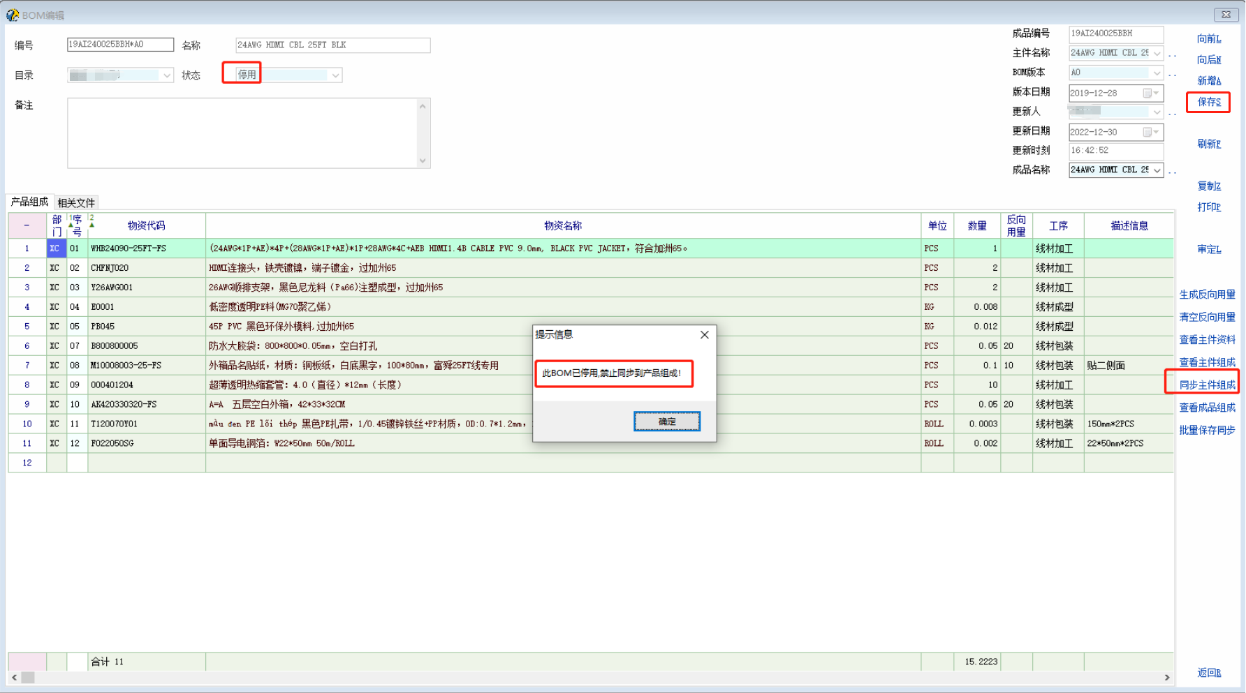 BOM更新建立新版本后,会停用旧版本,有时会先停用旧版本再更新新的版本,为防止在更新【新版本BOM】之前忘记删除旧版本的产品组成明细而被做【材料需求表】,特增加在修改BOM状态为【停用】后保存的时候自动删除对应版本的产品组成明细(若有),并禁止同步停用状态的BOM明细到产品组成明细