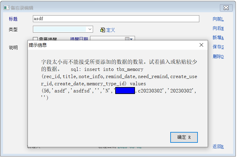 谢谢,@dragonzsp ,还有这种情况。问题是: 操作员登录就是设置这个ID, 并没有提示问题。难道 备忘录表格的ID宽度与其它表格不同?  如果因为这个原因改user_id有点牵强,有办法绕过吗?  另外,在商业机会中的备注好像也有类似问题,推测是一个原因。