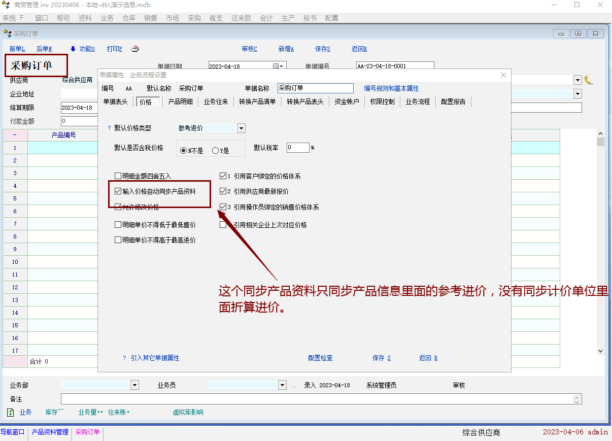 如标题输入价格自动同步产品资料只同步了基本信息里面参考进价,不能同步计价折算单位里面折算进价,同样参考售价也一样不能同步折算售价,如下图