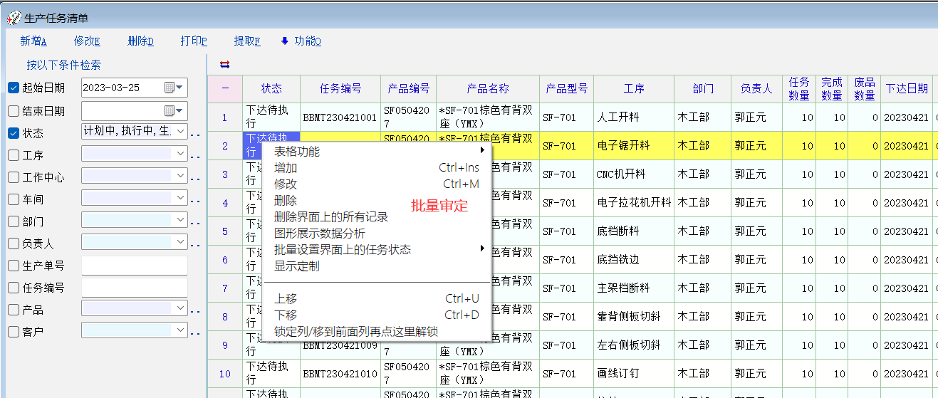 老师,可否在生产管理  工序任务、工序产出增加批量审定功能? 工序产出清单如任务清单一样增加删除界面上所有的记录(用于对导入错误的明细批量快速的删除)