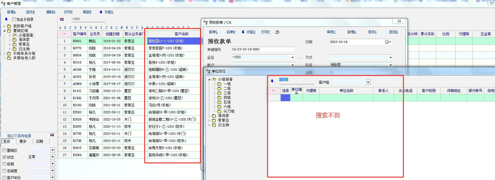 单据搜索客户时  有的关键字搜索不了   客户管理里有这些符合的数据   好像字符少了就不行    像  -301  -302  -402 ......        (有时第一次可以  第二次就搜不到了)            系统为最新版本23.10.16