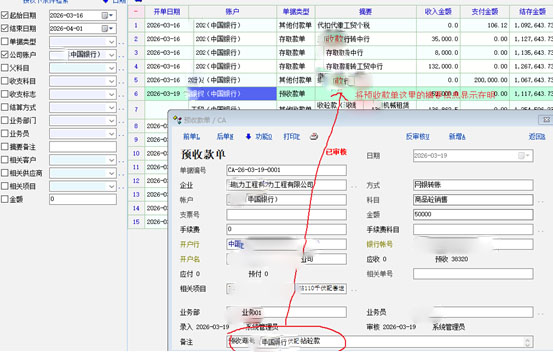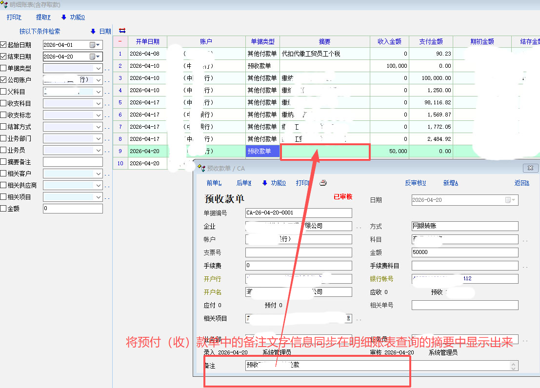 将预收(预付)款单最下面备注的信息,在明细账表查询窗口中显示出来