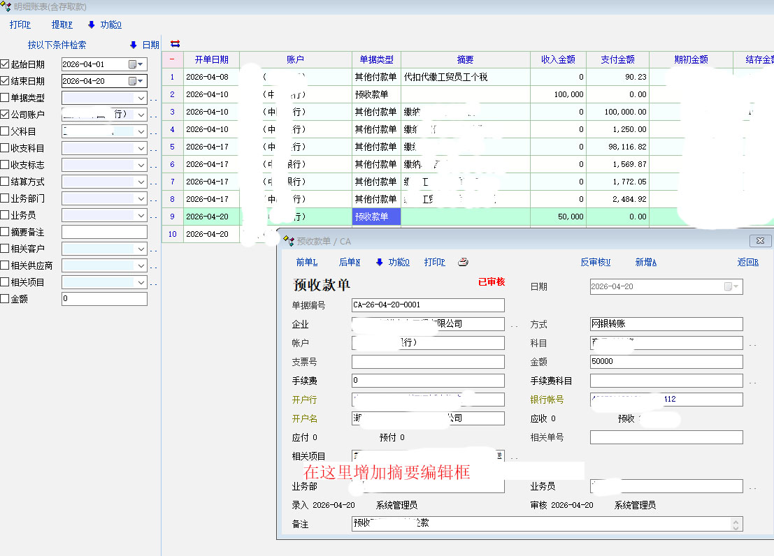 在预收(预付)款单最下面增加摘要信息编辑栏框,那么在查询明细账表查询显示窗口中就可以显示摘要信息了。