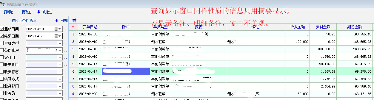 明细账表查询时需要显示收款相关单据的摘要信息,目前的版本还没有将预收(预付)款单最下面备注的信息显示出来。