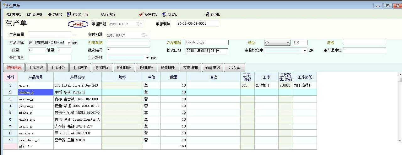 我们企业产品最终是组装产品。主物资是组装出来的,明细物资是不同的产品,不同产品的工序也是不同的。