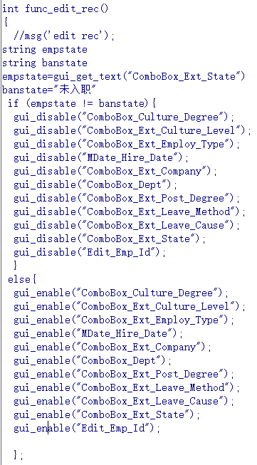 我在func_edit_rec()函数下写了一小段代码,就是在职工的在职状态不等于"未入职"时,入职日期这个控件失效(gui_disable),但是我发现:
