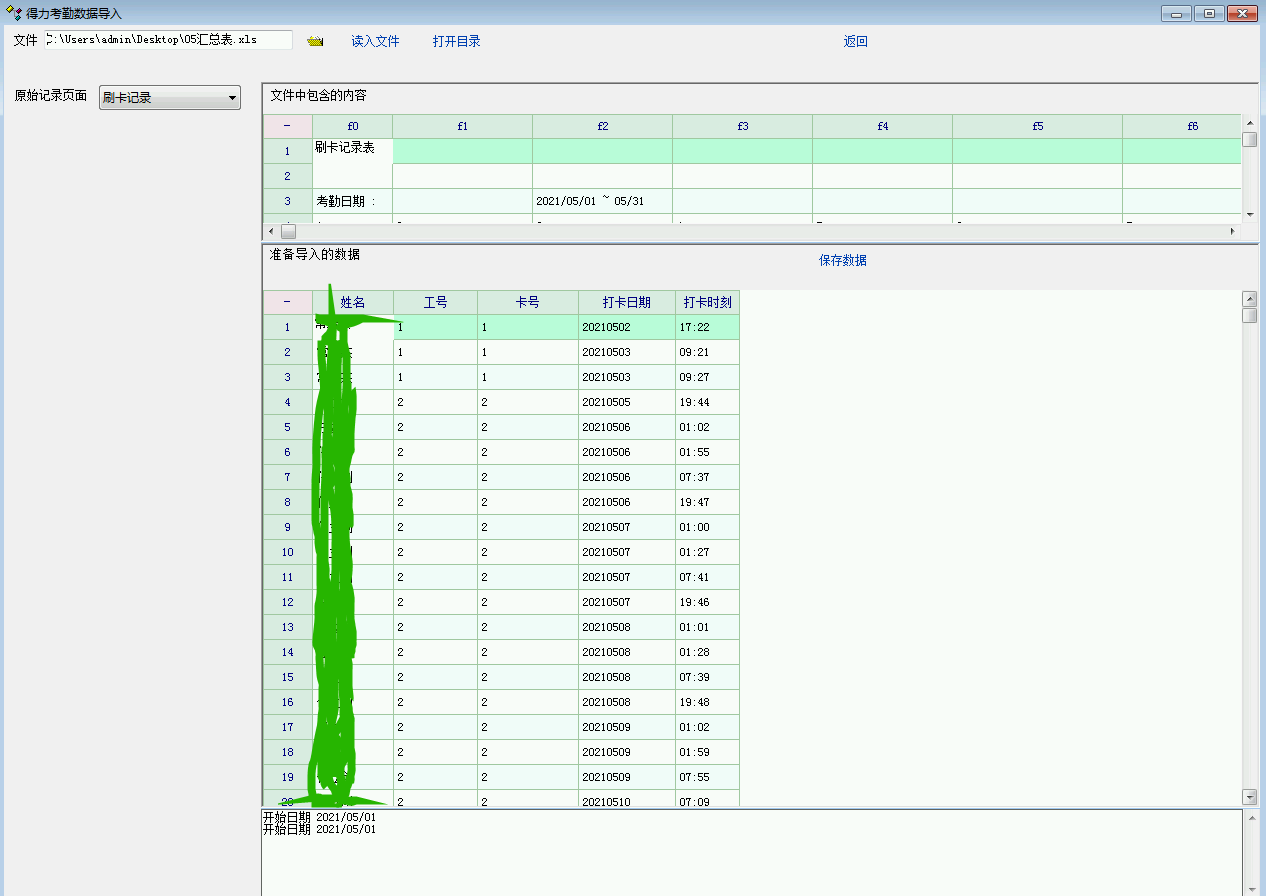 考勤机型号是3749,比较落后的打卡机,没网口。所以只能USB导出原始数据,然后数据采集,就出现了上面的问题