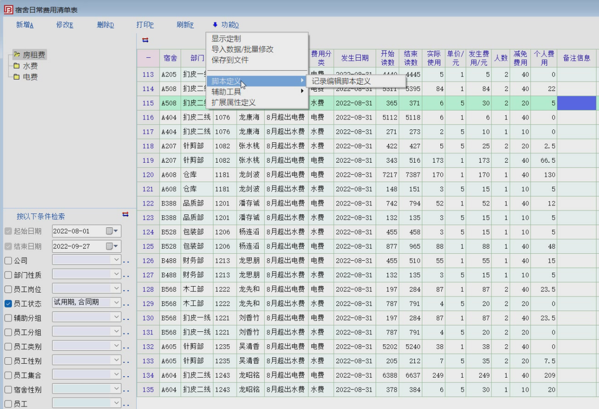 宿舍费用--目前有记录编辑脚本,希望老师把记录列表脚本定义也能加上,谢谢!