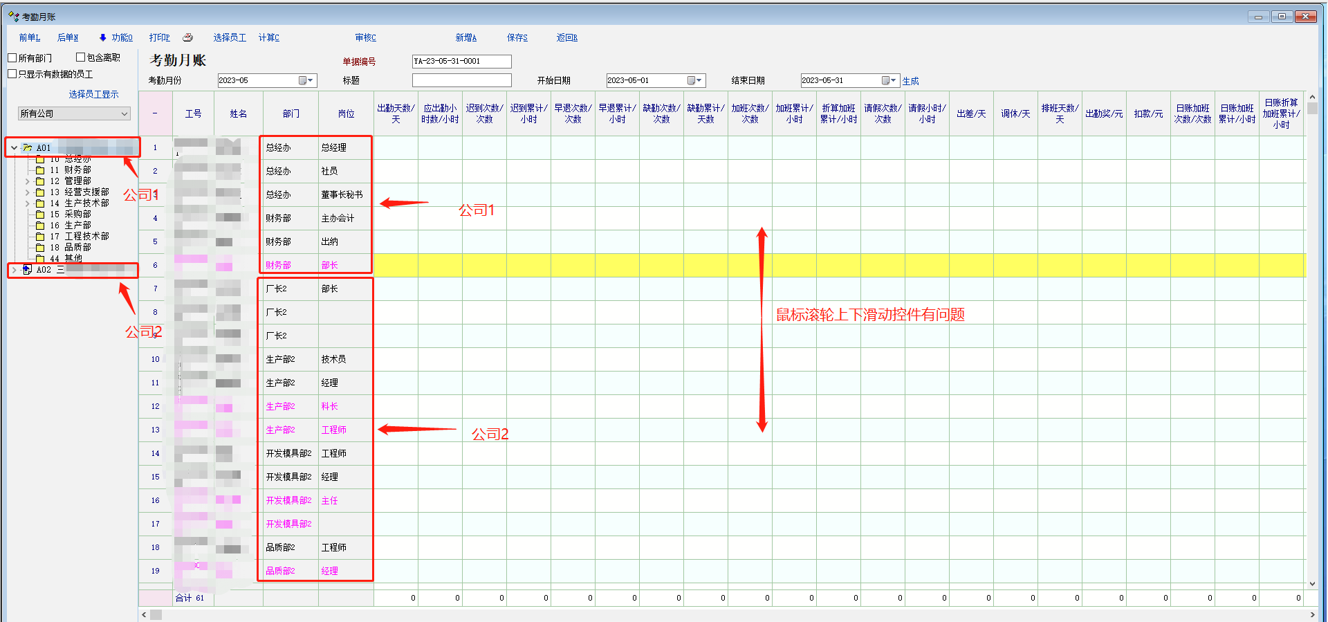 1.现有系统考勤月帐里无法完全区分筛选两个公司人员