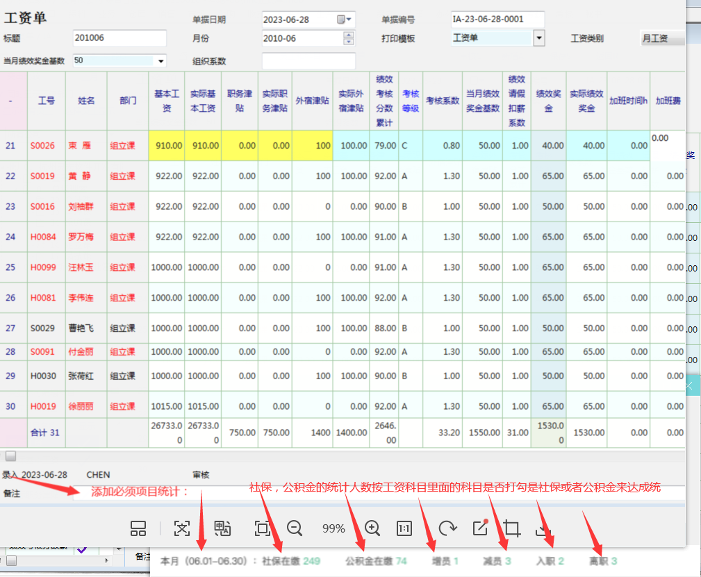 目前我们系统的工资单里面的统计项目不是很明确,没有一些必须项目,所以建议添加一些必须的统计项目:社保在交人数,公积金在交人数,入职,离职,增减人数等项目-------可以添加再工资单下面的备注栏,或者在备注栏下面再添加一栏这些数据的体现,打印出来的工资单一目了然。