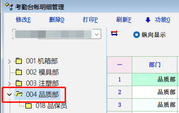 如图:左边目录树部门选品保员时,明细只显示部门为品保员的考勤明细,选择品质部时,只能显示部门为品质部的考勤明细,无法显示部门为品质部和品保员的考勤明细。