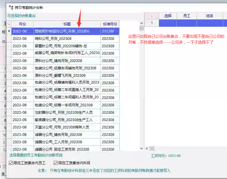 做工资单---手工复制考勤月帐数据-----权限限定了本部门或者本公司----在显示的月帐集合列表里面还是可以全体考勤月帐---造成一下子选择不到自己公司的考勤月帐数据