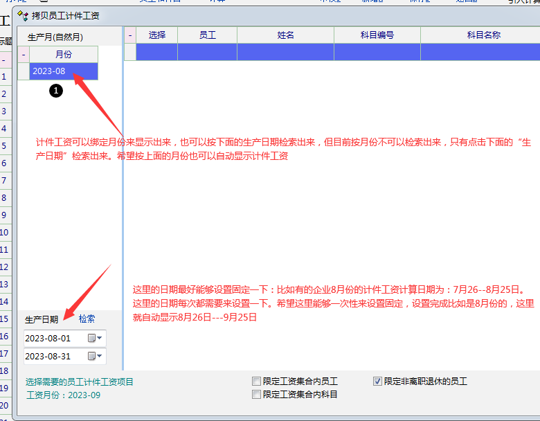 1,计件单据里面设置了工资月份,但是引入当月的计件的工资的时候,按月份的单据的计件工资引用不了,后面查询---发现还得选择生产日期的时间段-------才可以引入,这样就没有办法自动引入
