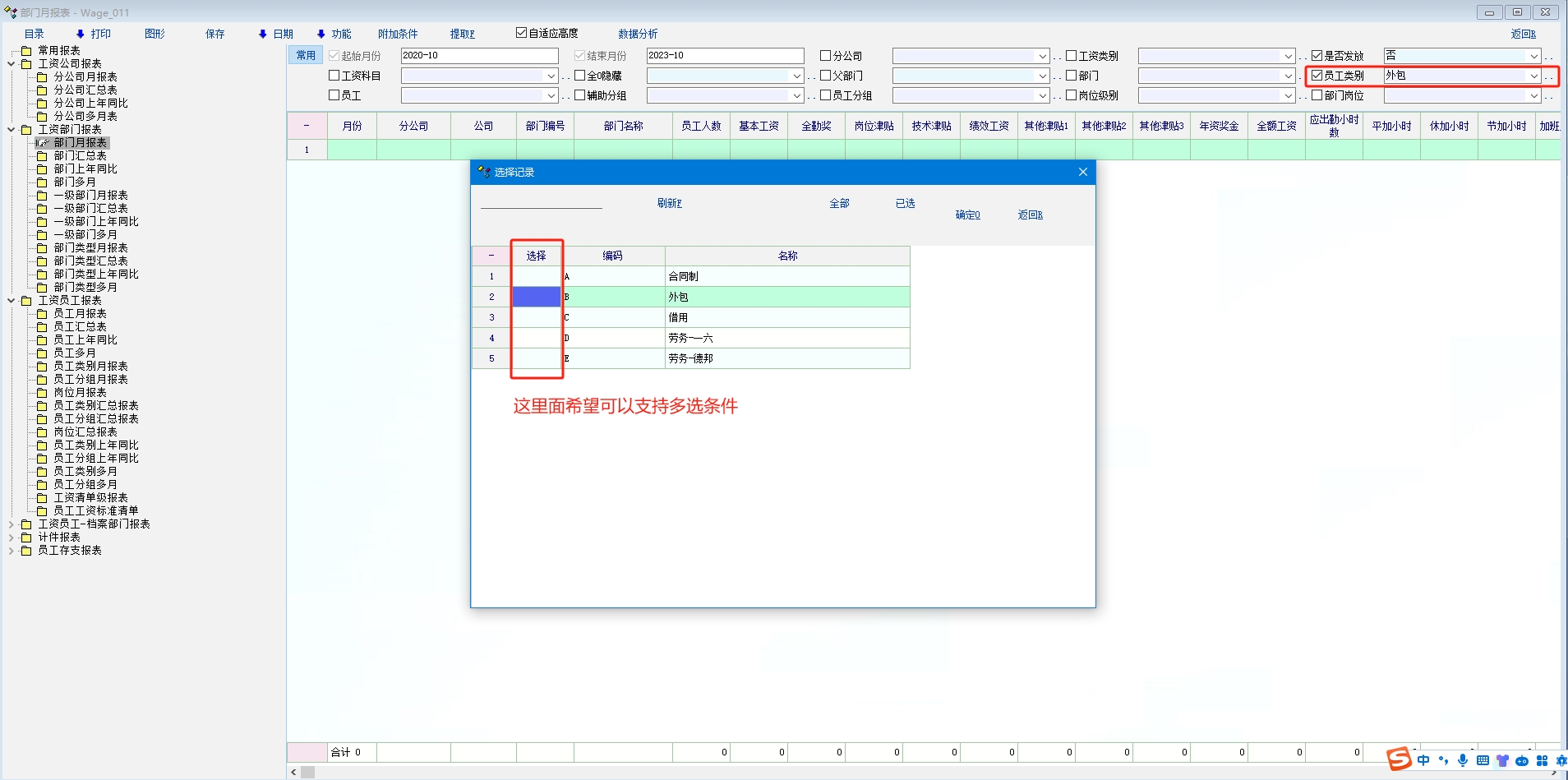 查看工资报表的时候,希望员工类别和员工选择选项可以支持多选操作,目前系统只能单选操作,希望老师能够改进一下,感谢!!!!