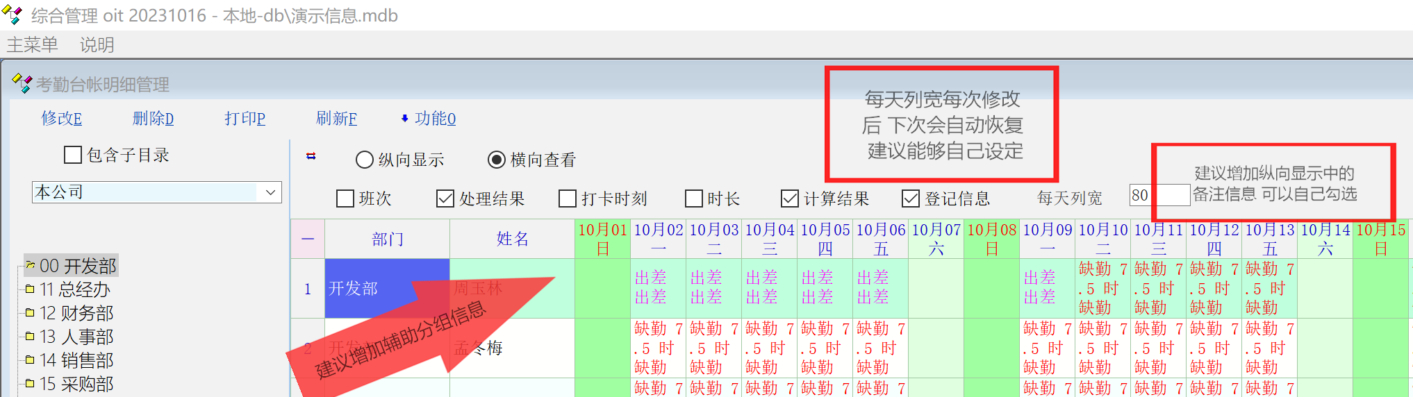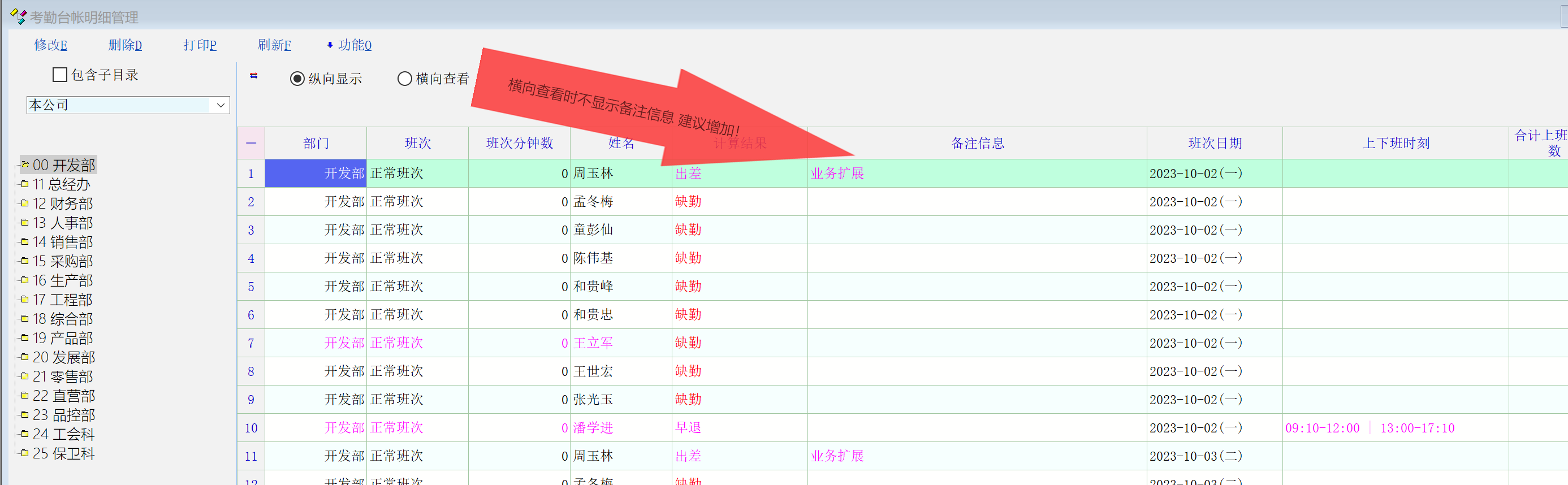 2.计算结果为出勤的时候  纵向显示 可以在备注信息里显示  出差类型  但是横向显示没有 建议增加!