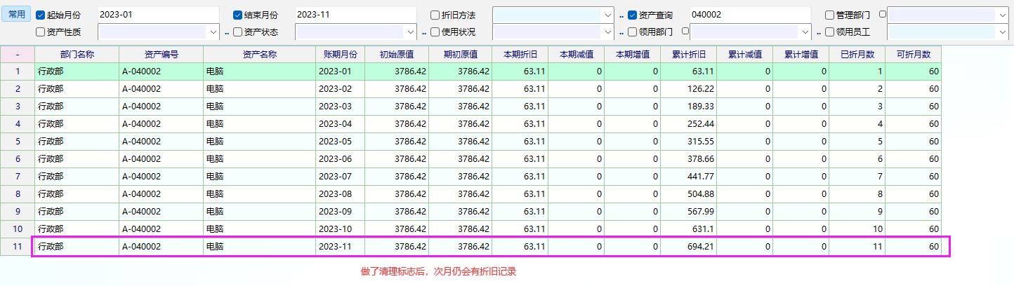 清理标志和清理日期都有,但是报表显示次月折旧仍有金额