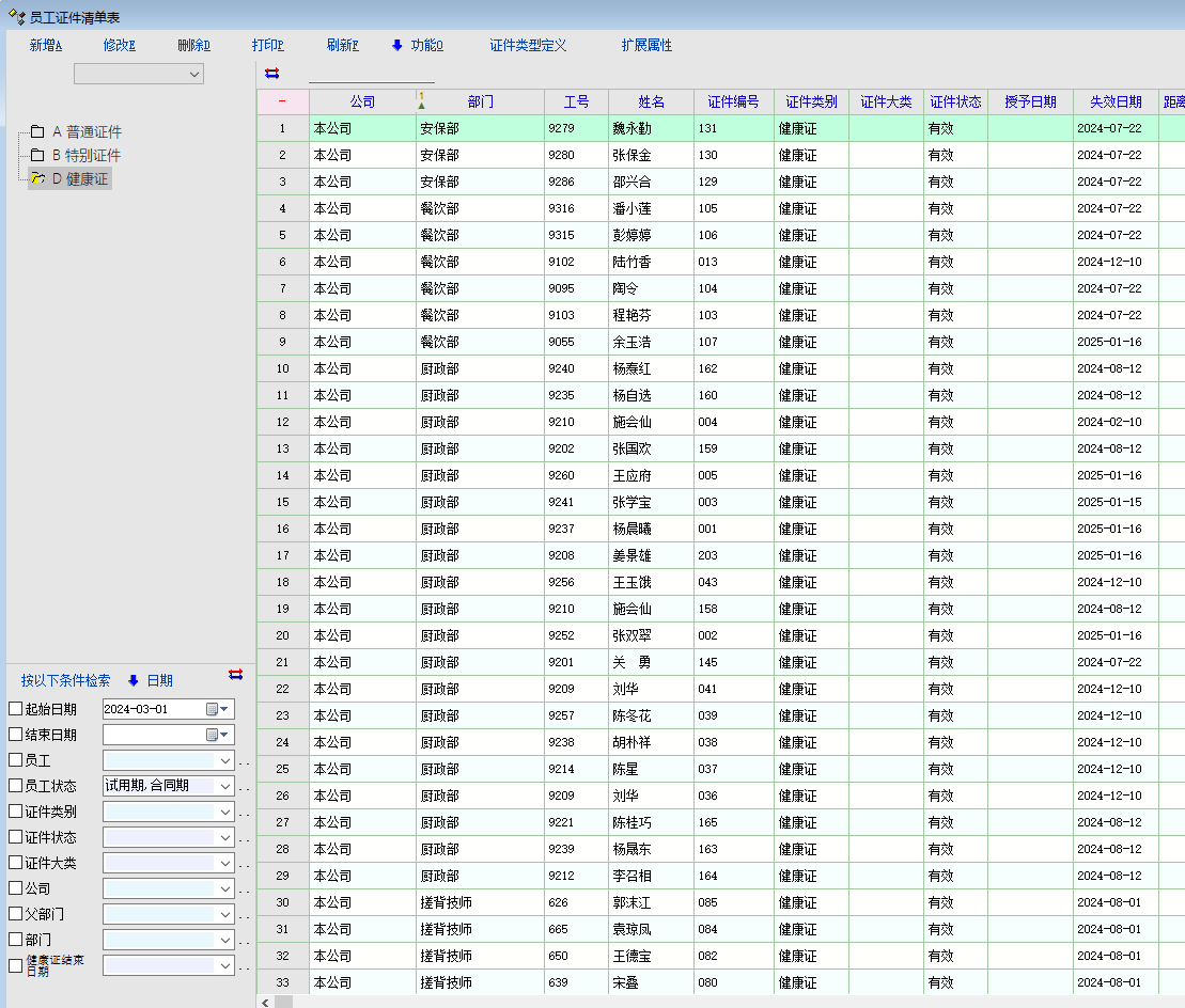 证照目录树上点右键有检测 检测无该证照的员工清单