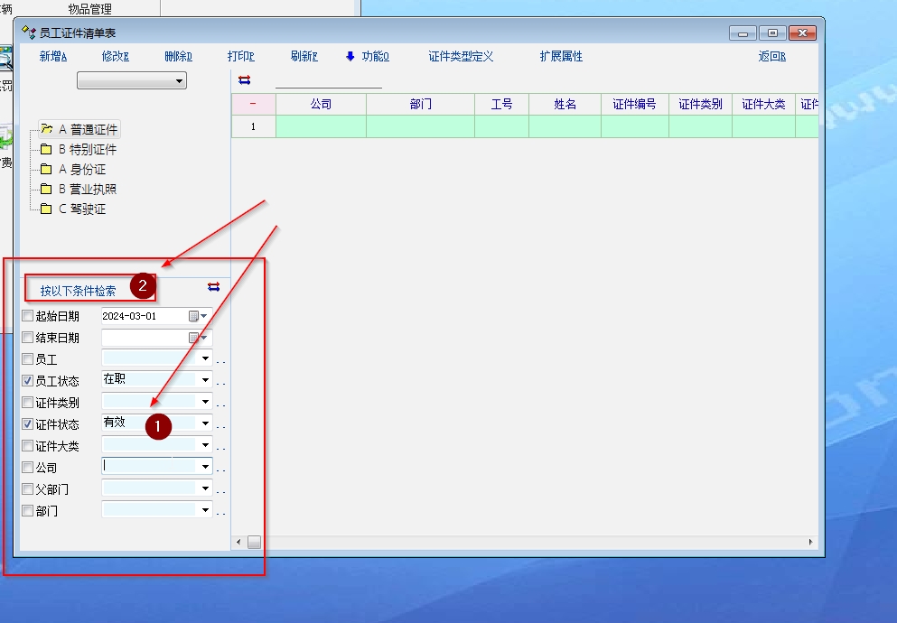 老师们,证照管理这里如何实现筛选功能,有证和无证的,分别筛选出来。。是否能增加一个筛选功能,把系统里有证和无证的筛选出来,方便做统计