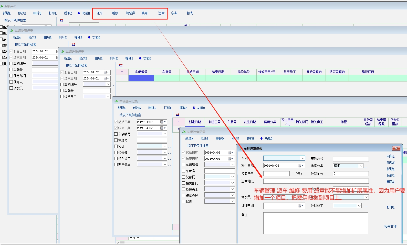 车辆管理增加扩展属性 用户想增加一个扩展来费用归集到项目上