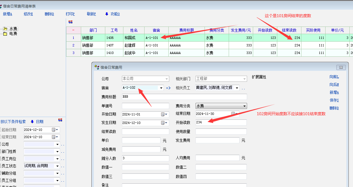 目前,在这个系统中,员工宿舍管理的“水电费”分摊方式,只是对入住人员进行平摊,而没有考虑中途入住和中途退宿的人员,这点是不合理的。