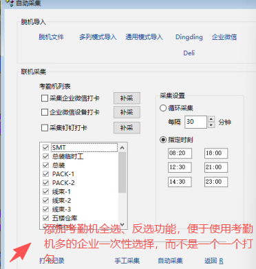 在考勤数据采集界面添加----全选、反选考勤机选项----方便考勤机多的企业一次性选择