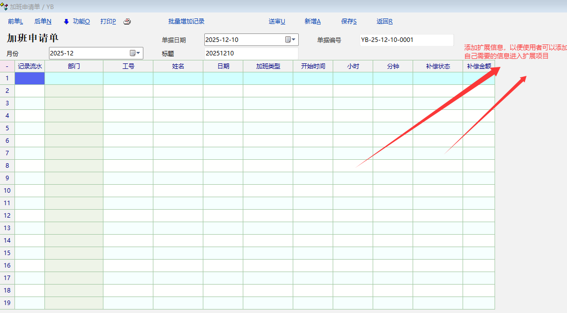 在考勤管理--加班申请单据里面添加扩展项目,以便使用者添加所需项目: