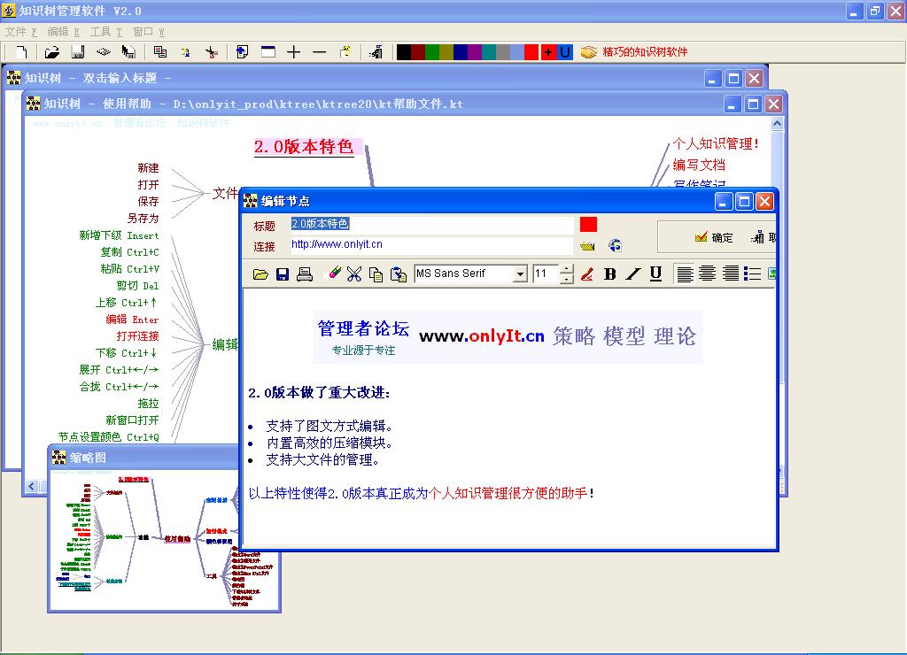 知识树软件是一款绿色软件,可以用于写作笔记、导航型html、会议记录、文件索引、教学演示、制作帮助等,非常方便,只有不到1兆大小,免安装解开直接运行