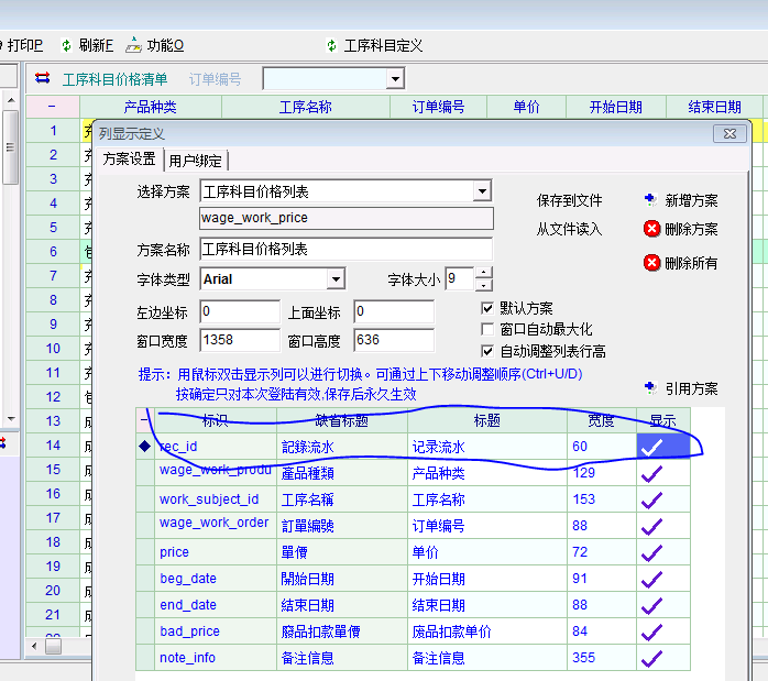 工序科目价格定义 流水号列无法显示。显示定制选择保存后自动跳掉也无法显示。
