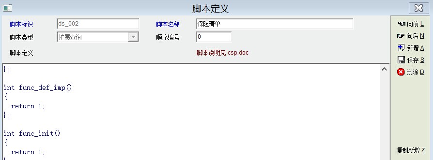倒是没想过access的语法问题,一向不用垃圾access。 注意到两者区别没有,上面版主把是否停止的“是/否”的显示替换去掉了,因为access数据库不支持,出来的结果这一列就变成''Y"/"N" 可以再改改,选替换显示,显示完再换回来,按下面的 int func_def_lmt() { def_lmt_set_val("aa","a") return 1; }; int func_def_field() { db_set_field_count(11); db_set_field_info(0,'dept_name',"部门",80); db_set_field_info(1,'emp_id',"工号",50); db_set_field_info(2,'name',"姓名",50); db_set_field_info(3,'paper_id',"身份证号",150); db_set_field_info(4,'home_address',"家庭住址",150); db_set_field_info(5,'insurance_name',"保险类型",50); db_set_field_info(6,'beg_month',"开始日期",50); db_set_field_info(7,'stop_flag',"是否停止",50); db_set_field_info(8,'end_month',"终止日期",50); db_set_field_info(9,'v_no',"保险编号",50); db_set_field_info(10,'note_info',"备注",50); return 1; }; int func_def_imp() { return 1; }; int func_init() { return 1; }; int func_query() { string sql; db_run("update emp_insurance set stop_flag='是' where stop_flag='Y'") db_run("update emp_insurance set stop_flag='否' where stop_flag='N'") sql="select b.dept_name,a.emp_id,c.name,c.paper_id,c.home_address,d.insurance_name,a.beg_month, " sql=sql+"a.stop_flag ,a.end_month,a.v_no,a.note_info from emp_insurance a,emp_dept b,emp " sql=sql+"c,emp_insurance_type d " sql=sql+"where a.emp_id=c.emp_id and b.dept_id=c.dept_id and a.insurance_type_id=d.insurance_type_id" db_run(sql) db_run("update emp_insurance set stop_flag='Y' where stop_flag='是'") db_run("update emp_insurance set stop_flag='N' where stop_flag='否'") return 1; }; |