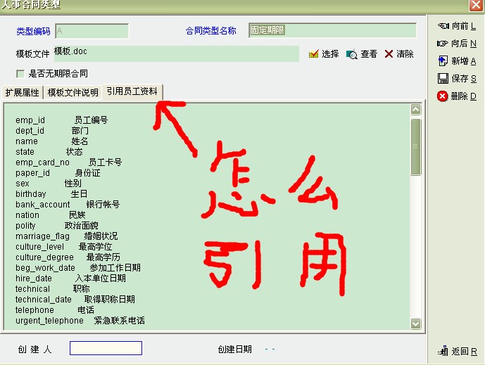 “引用员工资料”选项里是emp员工资料表的字段意义,给你参考用的,要引用哪个字段,在“引用员工资料”选项里看,如要添加手机,可以看到“mobile              手机”,那么字段名mobile的值就是手机。