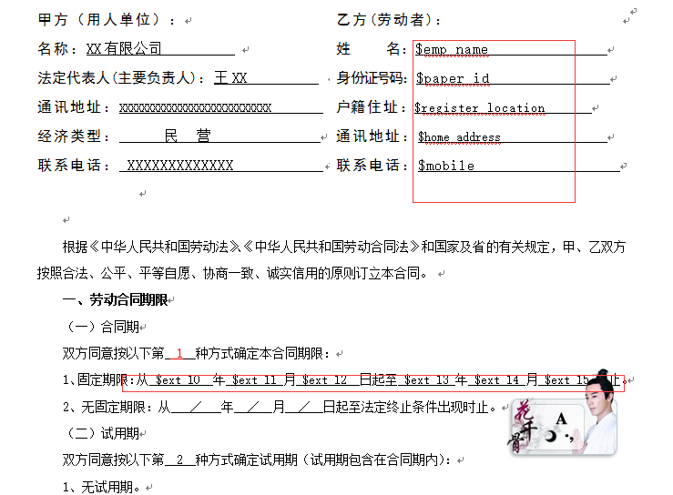 员工个人资料里面有很多信息,合同中可以用到的例如:身份证号、电话、住址等等
