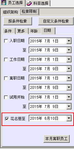 在计算工资时,有一项是选择人员,在这里可以选择花名册的日期,这个功能非常好,这样在上个月离职的员工,只要选择1号,他的名字也会被sort出来。
