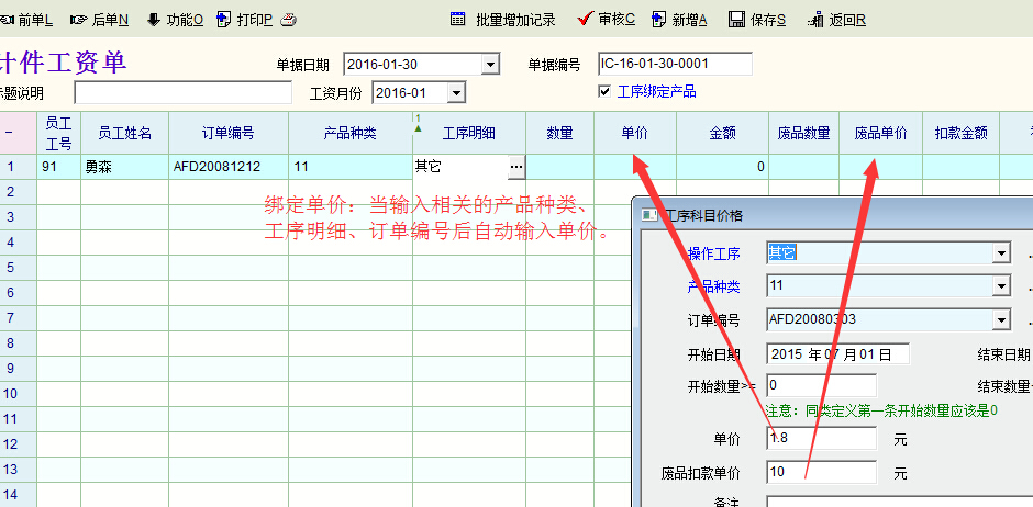 如图,建议在计件工资单中自动输入对应的单价及废品单价。就像销售单中自动输入客户上次的单价一样。在产品种类、工序比较多的情况下,可以省略查询计件工价的步骤(很麻烦、也很容易出错),大大提高效率。