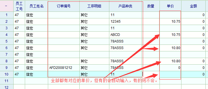 经过多次测试,发现“产品种类+工序明细”、“产品各类+工序明细+订单编号”有时候系统也会自动输入计件单价,但完全不清楚什么情况下系统会自动输入对应单价,什么情况下不会自动输入对应单价。如果有规律,请老师指点一下!