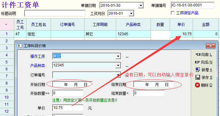 如图片1,工序科目价格定义时如果没有开始日期与结束日期,在计件工资单中输入工序与产品各类后,系统会自动输入绑定的单价。但如果在工序科目价格定义时添加了开始日期与结束日期(如图片2)后,退出系统,再次登陆(系统刷新相关资料)后,系统就不会自动输入绑定单价了。