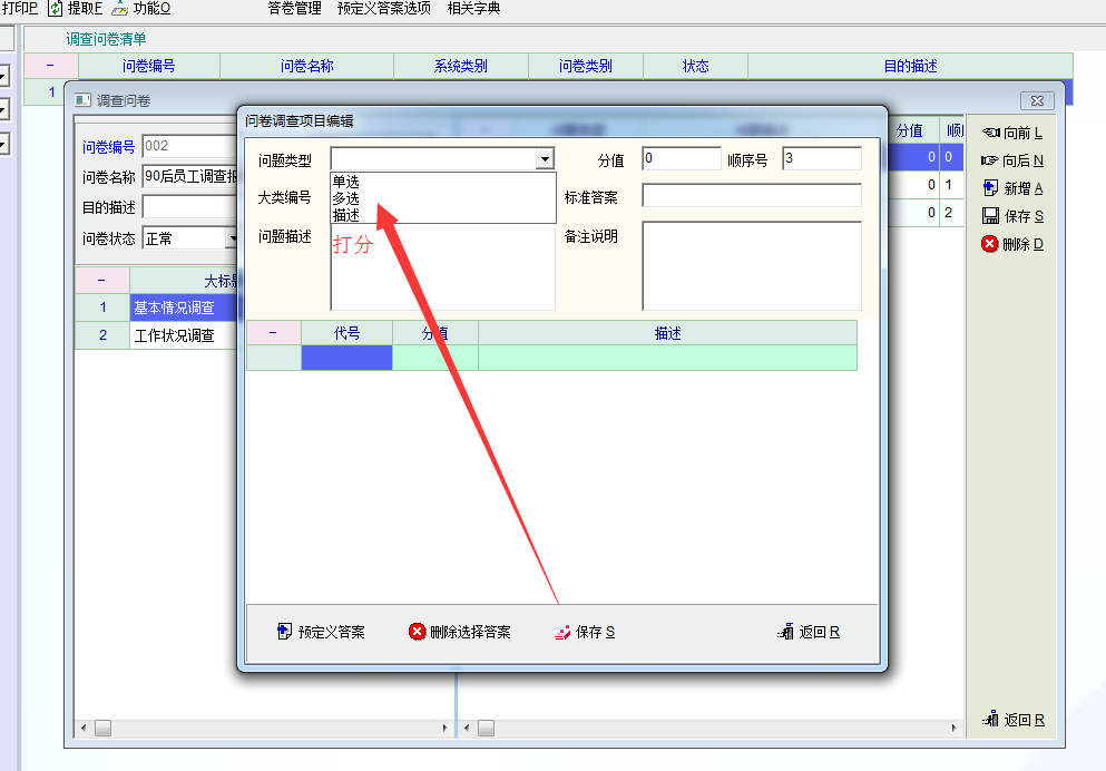 还建议”问题类型“中增加”打分“类型,这主要用在公司内部的民主评议中,由员工对被测评人进行打分,”打分“类型的分数可以自动计算。