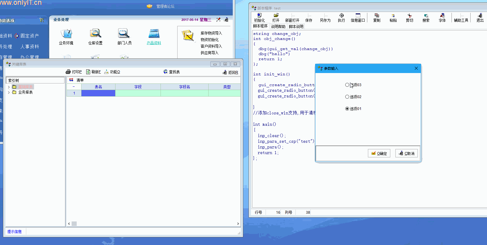 //请打开数据脚本,并保存为test string change_obj; int obj_change() { //问题:未响应下面事件gui_create创建的控件 dbg(gui_get_val(change_obj)) dbg("hello") return 1; }; int init_win() { gui_create_radio_button("this","rb5",100,90,80,60,"选项01"); gui_create_radio_button("this","rb3",100,50,80,60,"选项02"); gui_create_radio_button("this","rb1",100,10,80,60,"选项03"); gui_create_radio_button("Panel_Func","b6",50,2,80,60,"我还在这"); gui_list_all() } //问题:如何清理上面创建的控件,当下次inp_para运行时,会残留在界面上 int main() { inp_clear(); inp_para_set_csp("test"); inp_para(); return 1; }; |