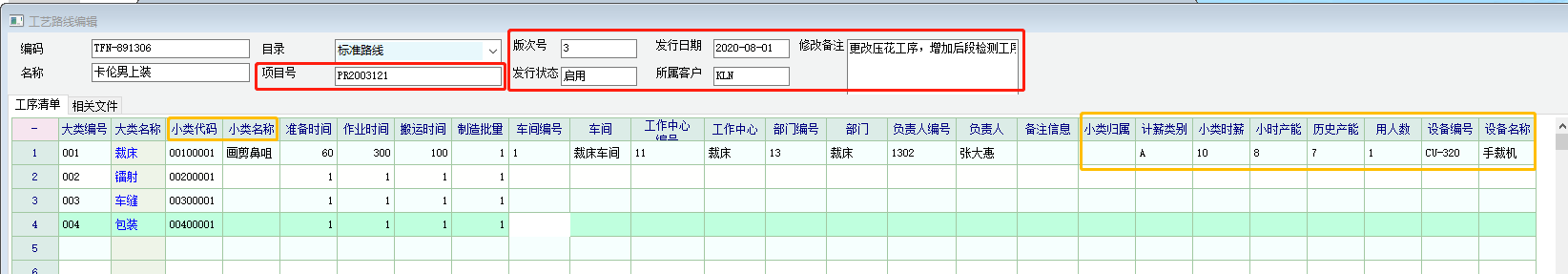 在工艺明细里,也需要记录一些,如时薪类别,计薪单价,使用的设备编号等