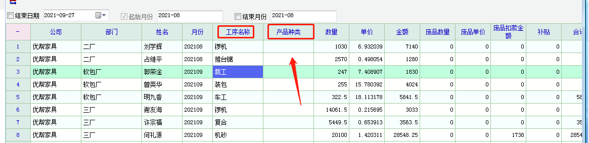 想要在自定义报表中,查询每月员工按不同工序 不同产品类型 分类汇总的报表,表头和效果如图所示。请赐教一下代码