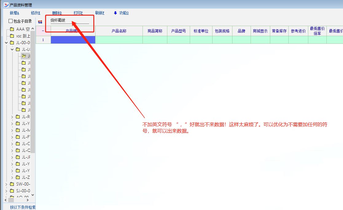 建议:优化为,不用加英文,号就能出来数据。例如:烧杯蜀玻。就可以出来相关的模糊数据。