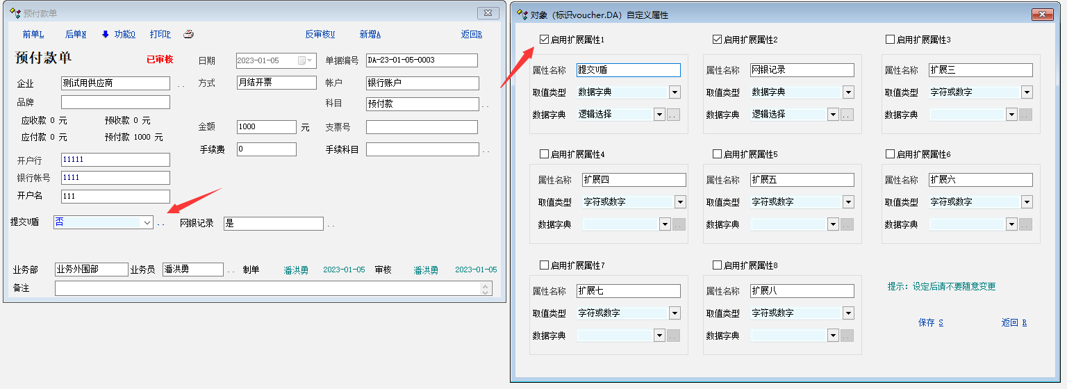2. 单据定义审后可修改的字段,选择单据扩展