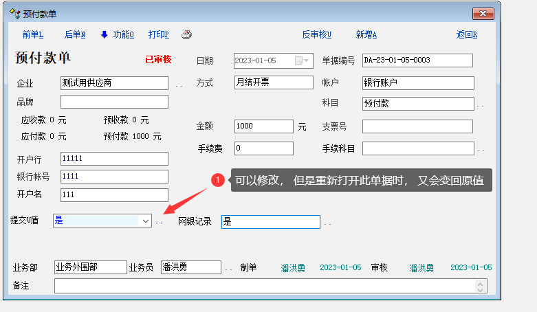 3. 单据审核后修改, 不生效。 重新打开又是原值。