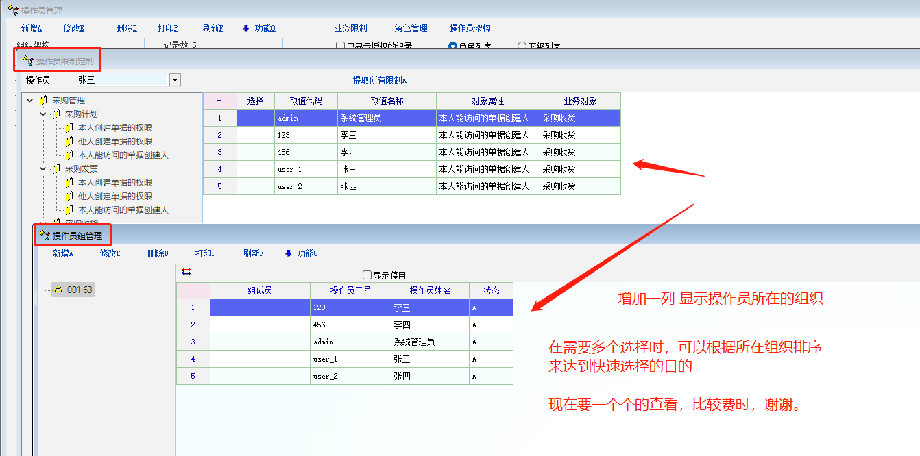 在操作员限制及操作员分组时,如果能 加一列 组织 显示出来,