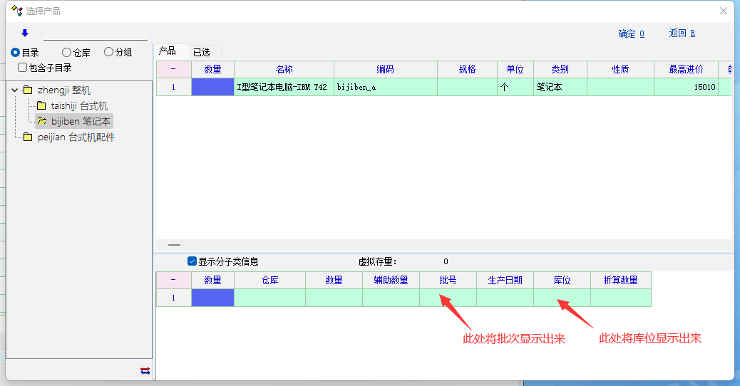 1:建议采购/销售出入库/移库等单据在选择产品界面可以显示批次