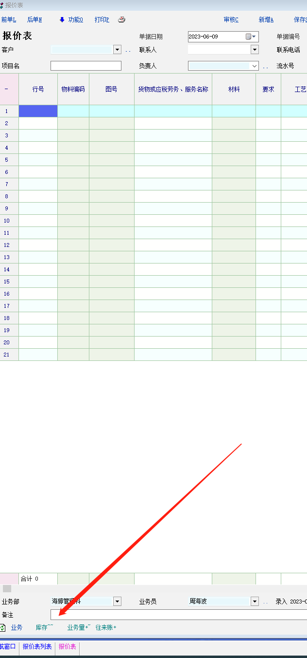 您好!我有个问题想您帮忙解答一下,万分感谢!!,请问如何用函数设置销售单据中的报价表表格下面的备注行的内容,谢谢!