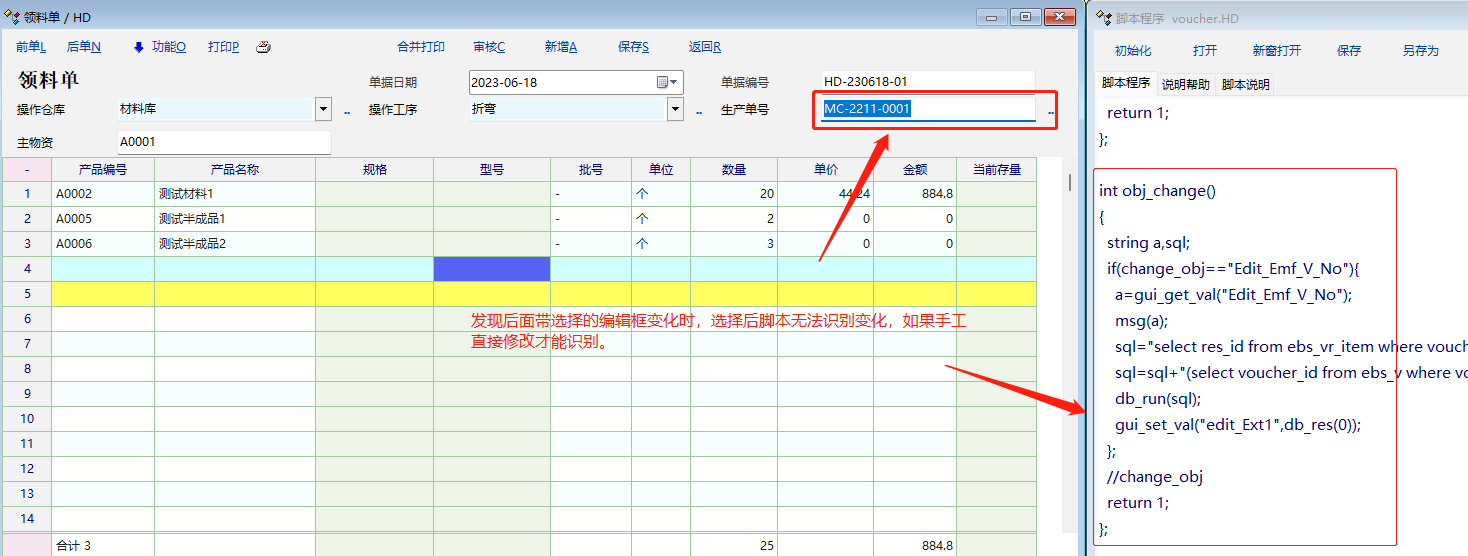 单据中写了脚本,在单据控件变化时执行,实验发现如果界面的控件是右面带...选择功能的编辑框,使用选择后的变化脚本无法识别,如果是直接手工修改是可以的。