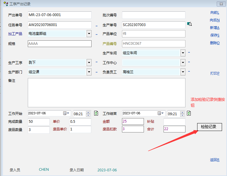 新建产出单保持后,点击界面上检验记录,填写检验记录。----------这就是生产工序的检验记录-----可以分析哪道工序,哪个作业内容产生的不良多,以便去改善作业工程。
