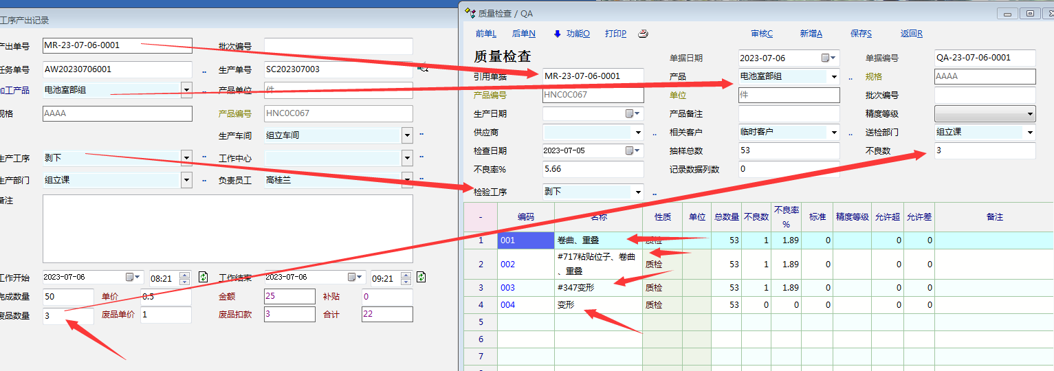 4,产出单上填写的“不良品”数量直接关联“检验记录”的单据-